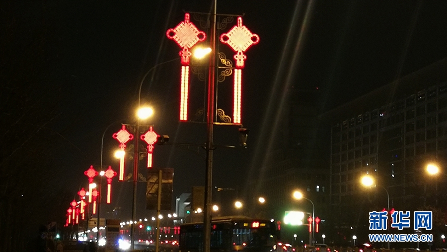 2018年2月13日,長(zhǎng)安街兩旁的燈柱整齊地掛滿了象征吉祥福瑞的中國(guó)結(jié)。新華網(wǎng) 張明宇 攝