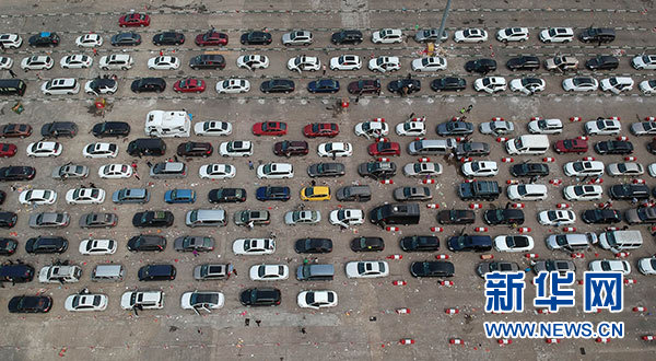 2月20日,大量過海車輛在??谛阌⒏鄣却^海。新華社記者 趙穎全 攝