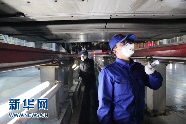 兩名工作人員在車底一前一后,保持著揚頭的姿勢從一端徒步走完8節(jié)車廂的長度,打著手電筒反復敲擊、仔細檢查每一個零件,用粉筆在車底標注了數(shù)十個記號進行對比檢查。
