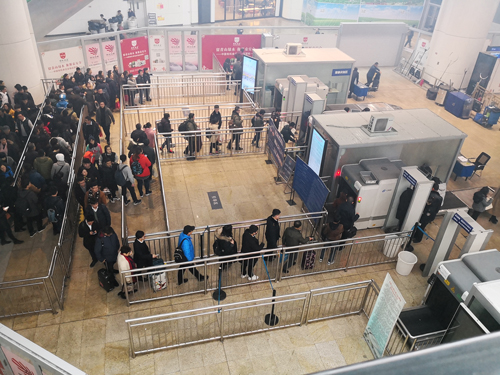在一個(gè)火車(chē)站安檢口,排起的長(zhǎng)龍和閑置的安檢通道形成鮮明對(duì)比
