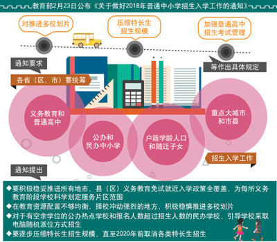 為進(jìn)一步治理義務(wù)教育階段“擇校熱”,解決中小學(xué)招生入學(xué)工作中的熱點(diǎn)難點(diǎn)問(wèn)題,教育部23日公布《關(guān)于做好2018年普通中小學(xué)招生入學(xué)工作的通知》,對(duì)推進(jìn)多校劃片、壓縮特長(zhǎng)生招生規(guī)模、加強(qiáng)普通高中招生考試管理等作出具體規(guī)定。>>