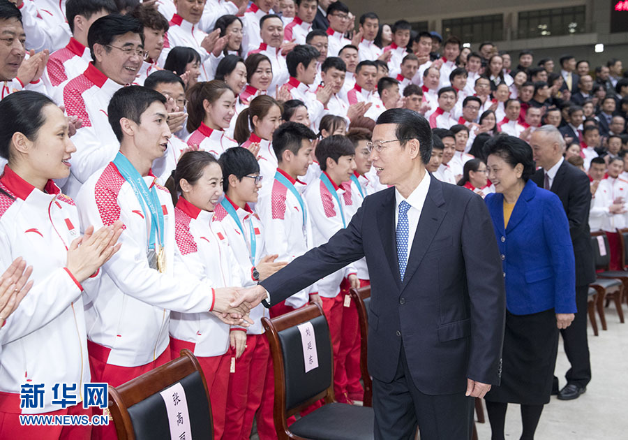 2月27日,國(guó)務(wù)院副總理、第24屆冬季奧林匹克運(yùn)動(dòng)會(huì)工作領(lǐng)導(dǎo)小組組長(zhǎng)張高麗在北京會(huì)見(jiàn)載譽(yù)歸來(lái)的平昌冬奧會(huì)中國(guó)體育代表團(tuán)。新華社記者王曄攝