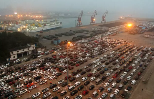 ▲ 2月22日,汽車在??谑行阌⒏鄹蹍^(qū)內(nèi)排隊等待出島。新華社記者趙穎全攝