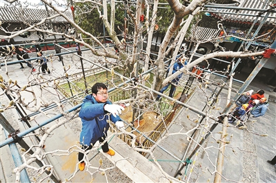 “為了修剪一棵樹(shù)而專(zhuān)門(mén)搭起腳手架,所做功夫之細(xì),這在北京城里也是較為少見(jiàn)的?!鳖U和園古樹(shù)管護(hù)中心負(fù)責(zé)人韓紅巖說(shuō),其目的是盡最大努力保護(hù)古樹(shù)。如果用梯子,移動(dòng)的時(shí)候容易把花苞碰掉,損壞枝條。樹(shù)冠深處的一些花苞也夠不著,存在修剪死角。頤和園采用搭腳手架這種獨(dú)有的修剪方式,所有問(wèn)題也就迎刃而解了。