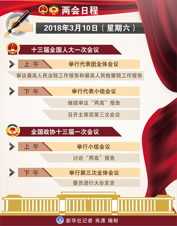 新華社北京3月9日電 十三屆全國人大一次會議10日上午舉行代表團全體會議,審議最高人民法院工作報告和最高人民檢察院工作報告。下午舉行代表小組會議,繼續(xù)審議“兩高”報告,召開主席團第三次會議。