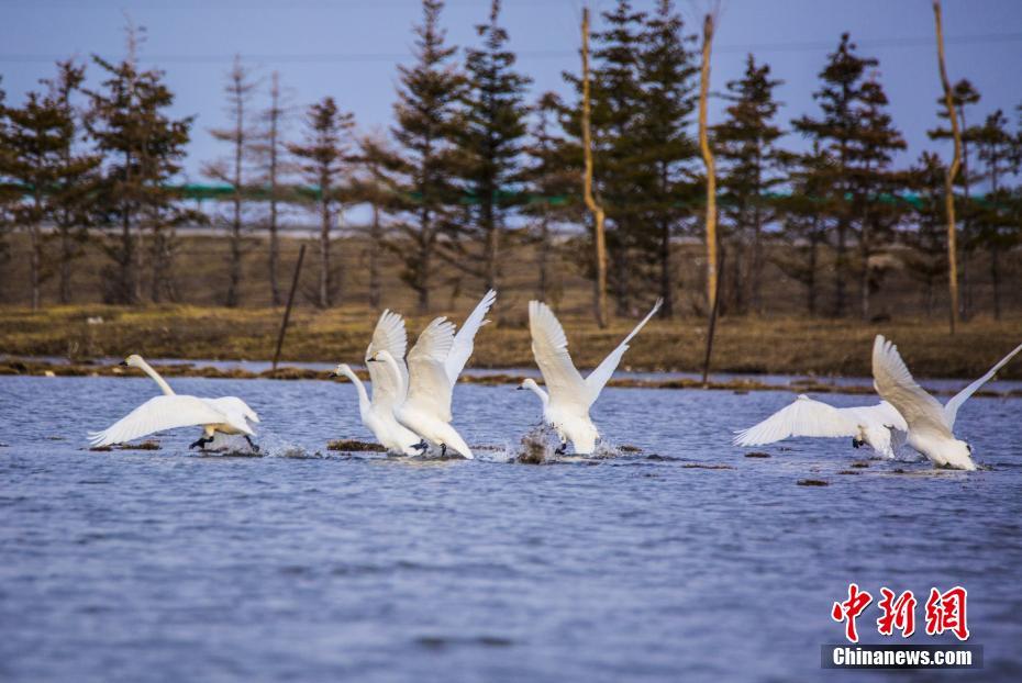 3月20日,天鵝在湖面上“舞蹈”。日前,內(nèi)蒙古自治區(qū)呼倫貝爾市陳巴爾虎旗陸續(xù)迎來(lái)大量北歸天鵝。據(jù)了解,每年四月份,成群的天鵝從中國(guó)南方遷徙到呼倫貝爾產(chǎn)卵繁殖,而今年三月中旬起,陳巴爾虎旗境內(nèi)便迎來(lái)大量回歸天鵝,實(shí)屬罕見(jiàn)。中新社記者 武軍 攝