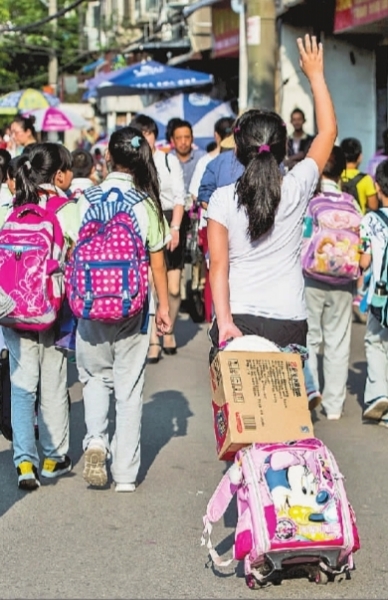 武漢市武昌區(qū),小學生們拖著沉重的書包放學回家。新華社記者 肖藝九攝