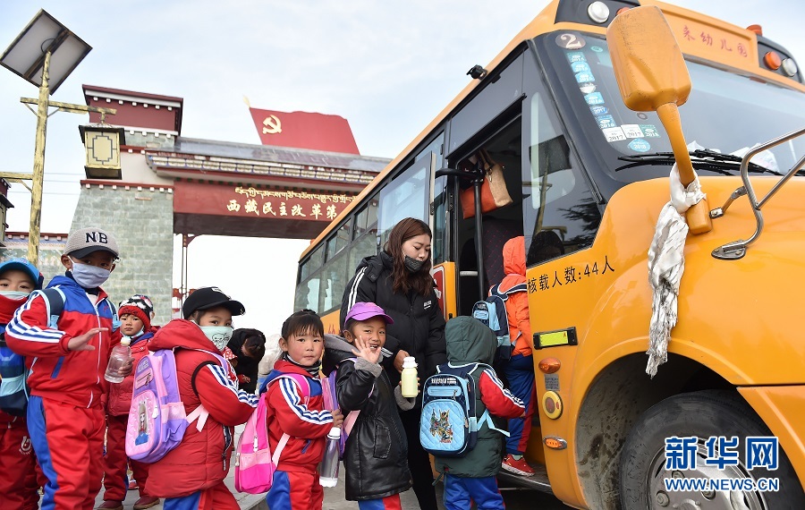 3月27日,克松村的孩子們登上校車出發(fā)去幼兒園。 新華社記者覺果攝