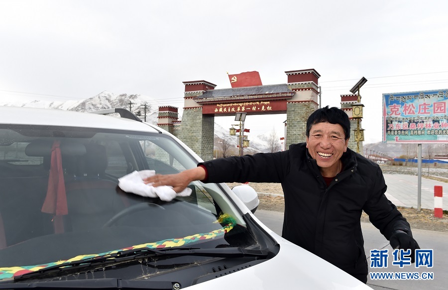 3月27日,克松村致富能手達(dá)瓦準(zhǔn)備開車出行。 新華社記者覺果攝