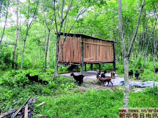 王成安在扶貧干部黃海軍的幫扶下,精準(zhǔn)選擇養(yǎng)殖市場穩(wěn)定的本地黑山羊,他在橡膠林建起了一座高腳羊舍,已賣了一批羊。劉鄧 攝