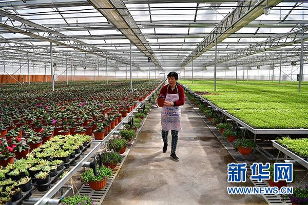 一名女工在秦漢鮮花港的大棚內(nèi)查看花草長勢(3月27日攝)。新華社記者 邵瑞 攝
