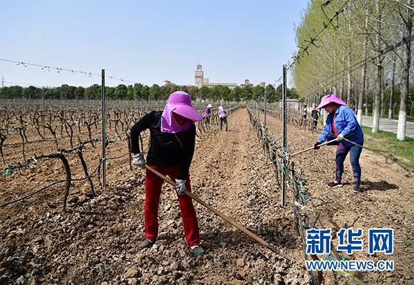 工人在陜西張裕瑞那城堡酒莊的葡萄園內(nèi)鋤草(3月27日攝)。新華社記者 邵瑞 攝