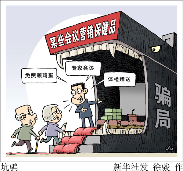 近日,“新華視點(diǎn)”記者采訪時(shí),多位老人鄭重提醒:“讓你媽媽千萬別買!” 新華社發(fā) 徐駿 作
