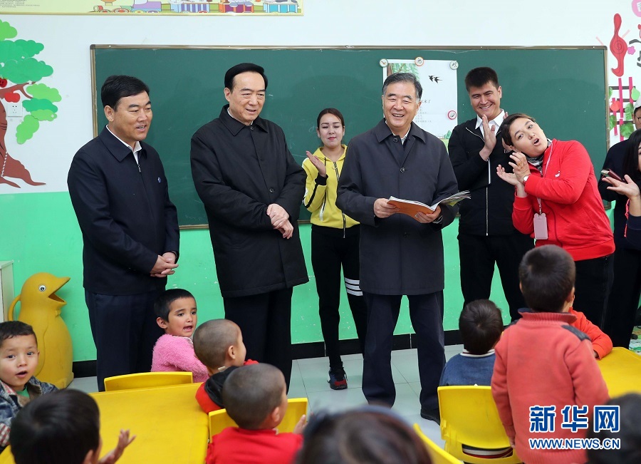 4月10日至14日,中共中央政治局常委、全國政協(xié)主席汪洋在新疆調(diào)研。這是4月11日,汪洋來到和田縣村里的幼兒園看望孩子?!⌒氯A社記者劉衛(wèi)兵 攝