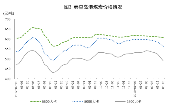 煤炭價格有所回落。截至3月底,秦皇島5500大卡煤炭平倉價為每噸607元,比去年年底下降10元;5000大卡每噸564元,下降33元;4500大卡每噸491元,下降36元。