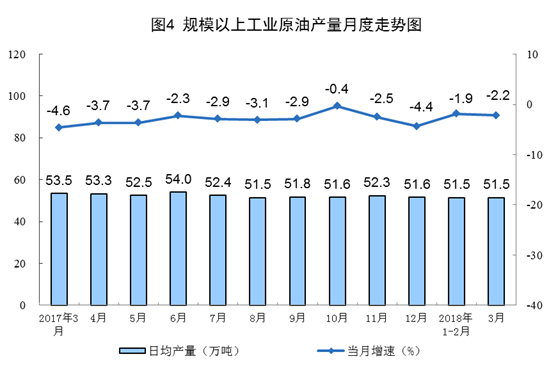 一季度,原油產量4633萬噸,同比下降2.0%,降幅比去年同期收窄4.8個百分點。3月份,原油生產同比下降2.2%,日均產量51.5萬噸。