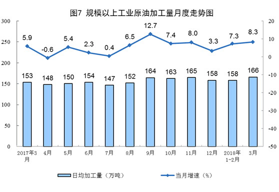 受去年下半年國內新增煉化產能陸續(xù)投產和2018年首批原油進口配額大幅增加影響,一季度原油加工量明顯增長,同比增長7.5%,增速比去年同期加快3.0個百分點。3月份,原油加工量同比增長8.3%,日均加工166.2萬噸,為歷史最高水平。其中,汽油、煤油和柴油產量分別增長5.7%、14.6%和1.3%。