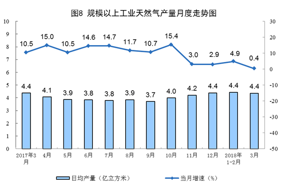 一季度,天然氣產量396.7億立方米,同比增長3.3%,受基數(shù)較高影響,增速比去年同期回落0.1個百分點。3月份,天然氣產量同比增長0.4%,日均生產4.4億立方米,依然保持最高日產水平。