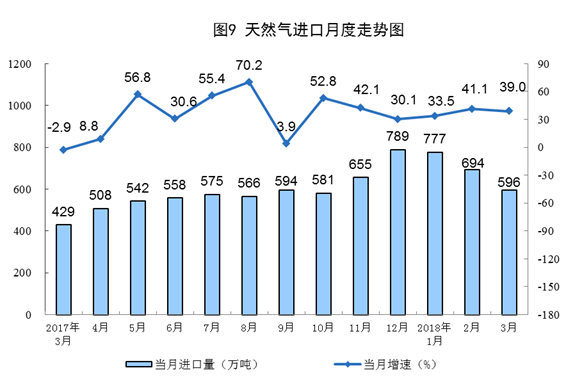 天然氣進口高速增長。一季度,進口天然氣2062萬噸,同比增長37.3%。3月份,進口天然氣596萬噸,同比增長39.0%,增速比1-2月份放緩2.1個百分點。