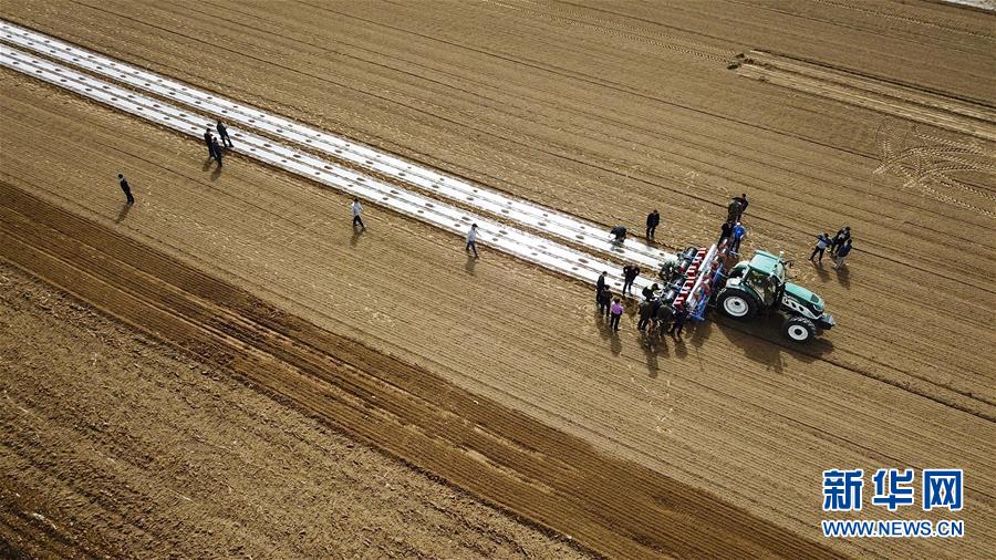 在新疆庫車縣牙哈鎮(zhèn)的一處棉田,“智能拖拉機”在進行播種作業(yè)(3月23日無人機拍攝)。國家統(tǒng)計局4月17日發(fā)布數(shù)據(jù),初步核算,一季度國內(nèi)生產(chǎn)總值198783億元,按可比價格計算,同比增長6.8%。 新華社記者 胡虎虎 攝
