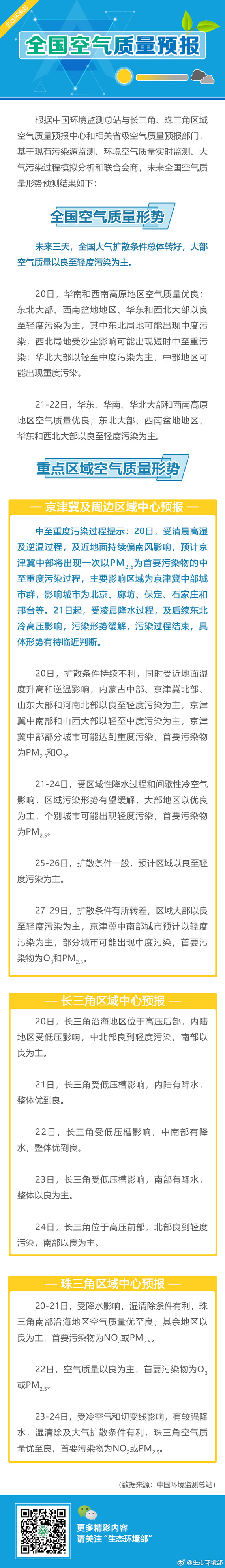 據(jù)生態(tài)環(huán)境部官方微博消息,未來三天(4月20-22日),全國大氣擴(kuò)散條件總體轉(zhuǎn)好,大部空氣質(zhì)量以良至輕度污染為主。