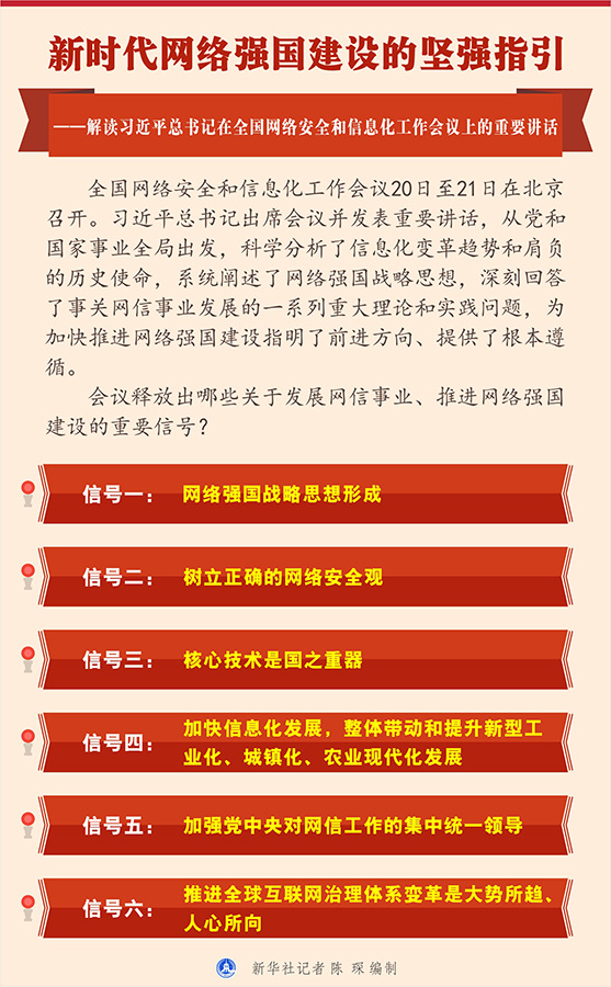 全國網(wǎng)絡(luò)安全和信息化工作會(huì)議20日至21日在北京召開。習(xí)近平總書記出席會(huì)議并發(fā)表重要講話,從黨和國家事業(yè)全局出發(fā),科學(xué)分析了信息化變革趨勢(shì)和肩負(fù)的歷史使命,系統(tǒng)闡述了網(wǎng)絡(luò)強(qiáng)國戰(zhàn)略思想,深刻回答了事關(guān)網(wǎng)信事業(yè)發(fā)展的一系列重大理論和實(shí)踐問題,為加快推進(jìn)網(wǎng)絡(luò)強(qiáng)國建設(shè)指明了前進(jìn)方向、提供了根本遵循。