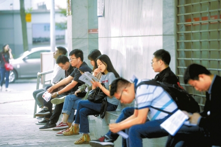 4月21日,在四川省公招公務(wù)員考點(diǎn)外,應(yīng)考者正在抓緊時間復(fù)習(xí)備考。