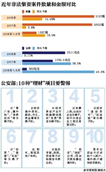 數(shù)據(jù)顯示,2017年非法集資實現(xiàn)“雙降”。據(jù)聯(lián)席會議辦公室統(tǒng)計,2017年全國新發(fā)涉嫌非法集資案件5052起,涉案金額1795.5億元,同比分別下降2.8%、28.5%,2018年1月至3月,新發(fā)非法集資案件1037起,涉案金額269億元,同比分別下降16.5%和42.3%,繼續(xù)保持“雙降”態(tài)勢。