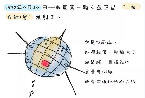 1970年4月24日,我國(guó)成功發(fā)射第一顆人造地球衛(wèi)星“東方紅1號(hào)”。衛(wèi)星運(yùn)行軌道,距地球最近點(diǎn)四百三十九公里,最遠(yuǎn)點(diǎn)二千三百八十四公里,軌道平面和地球赤道平面夾角六十八點(diǎn)五度。繞地球一周一百一十四分鐘。衛(wèi)星重一百七十三公斤。該衛(wèi)星發(fā)射成功標(biāo)志著中國(guó)成為世界上第五個(gè)用自制火箭發(fā)射國(guó)產(chǎn)衛(wèi)星的國(guó)家。