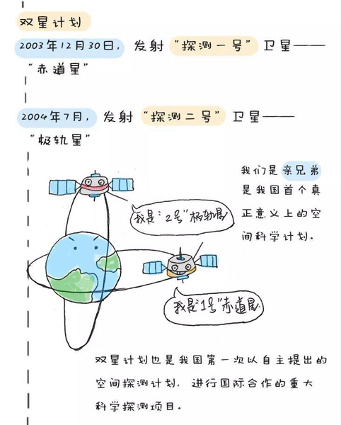 2003年12月30日,中國(guó)與歐洲空間局的合作項(xiàng)目“地球空間雙星探測(cè)計(jì)劃”中的第一顆衛(wèi)星“探測(cè)一號(hào)”成功發(fā)射。這是中國(guó)第一次發(fā)射高軌道衛(wèi)星,標(biāo)志著中國(guó)高水平的空間物理與環(huán)境探測(cè)進(jìn)入實(shí)質(zhì)性發(fā)展階段。2004年7月,“探測(cè)二號(hào)”衛(wèi)星升空,與已在軌運(yùn)行的“探測(cè)一號(hào)”衛(wèi)星構(gòu)成了具有創(chuàng)新特色的星座式獨(dú)立探測(cè)體系。兩顆衛(wèi)星互相配合,分別運(yùn)行于目前國(guó)際上地球空間探測(cè)衛(wèi)星尚未覆蓋的重要空間活動(dòng)區(qū)域,主要進(jìn)行太陽活動(dòng)、行星際擾動(dòng)觸發(fā)磁層空間暴和災(zāi)害性地球空間天氣的物理過程等科學(xué)研究。