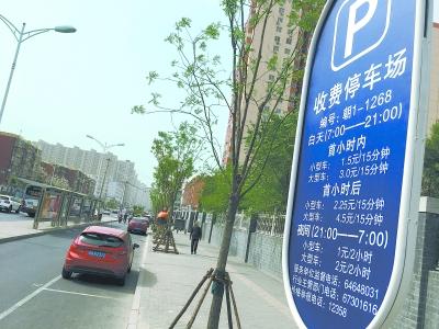 路側(cè)停車(chē)一刻鐘免費(fèi),已經(jīng)在正規(guī)管理的停車(chē)場(chǎng)實(shí)施了,但路側(cè)停車(chē)的收費(fèi)牌卻大多還未更新。 記者 甘南 攝