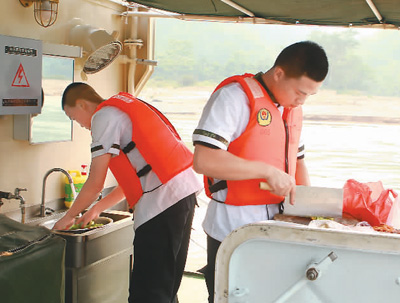 聯(lián)合巡邏執(zhí)法中,吃飯睡覺(jué)都在船艇上。做飯是由船艇上的執(zhí)法人員輪流來(lái)做。圖為53911艇上負(fù)責(zé)做飯的執(zhí)法人員在洗菜切菜。記者 張一琪 攝
