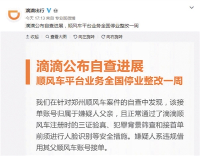 昨日下午,滴滴公司公布鄭州順風(fēng)車案自查進(jìn)展,稱順風(fēng)車平臺(tái)業(yè)務(wù)全國停業(yè)整改一周。