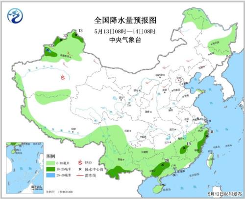 5月13日08時(shí)至14日08時(shí),江南大部、華南、西南地區(qū)中南部、新疆北疆地區(qū)、黑龍江東部和北部等地有小到中雨,其中,新疆伊犁河谷局地有大雨,上述局部地區(qū)將伴有雷暴大風(fēng)、短時(shí)強(qiáng)降水等強(qiáng)對(duì)流天氣。華北西部、西北地區(qū)東北部、內(nèi)蒙古中東部、新疆北部等地的部分地區(qū)有4~6級(jí)風(fēng),新疆南疆盆地局地有揚(yáng)沙或浮塵(見圖2)。
