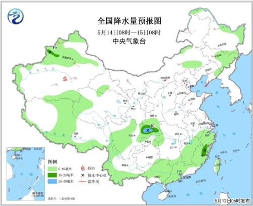 5月14日08時(shí)至15日08時(shí),東北地區(qū)東部、江南中東部、華南大部、新疆北部、四川大部、云南西部和南部、西藏中部等地有小到中雨,其中,四川盆地北部局地有大雨。東北地區(qū)、華北南部、黃淮東部、江淮東部、西北地區(qū)東北部、內(nèi)蒙古、新疆北部和南疆盆地等地的部分地區(qū)有4~6級(jí)風(fēng),新疆南疆盆地局地有揚(yáng)沙或浮塵(見圖3)。