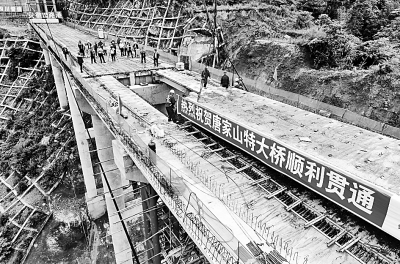 5月11日上午,隨著四川北川羌族自治縣唐家山堰塞湖跨湖大橋最后一塊橋面梁板架設(shè)完成,唐家山特大橋順利貫通,預(yù)計(jì)今年8月底具備通行能力。蒲滔攝/光明圖片