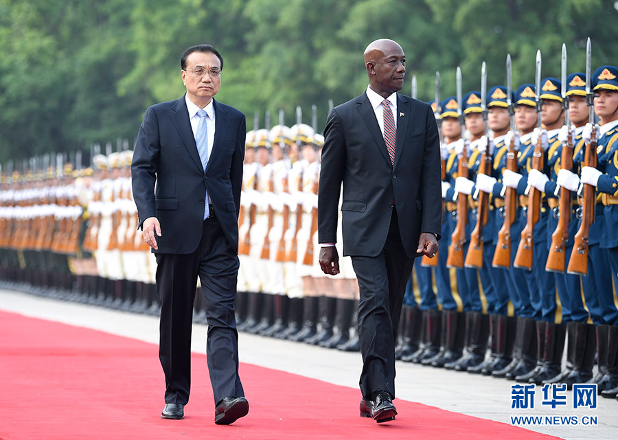 5月14日,國(guó)務(wù)院總理李克強(qiáng)在北京人民大會(huì)堂同來華進(jìn)行正式訪問的特立尼達(dá)和多巴哥總理羅利舉行會(huì)談。會(huì)談前,李克強(qiáng)在人民大會(huì)堂東門外廣場(chǎng)為羅利舉行歡迎儀式。新華社記者 燕雁 攝