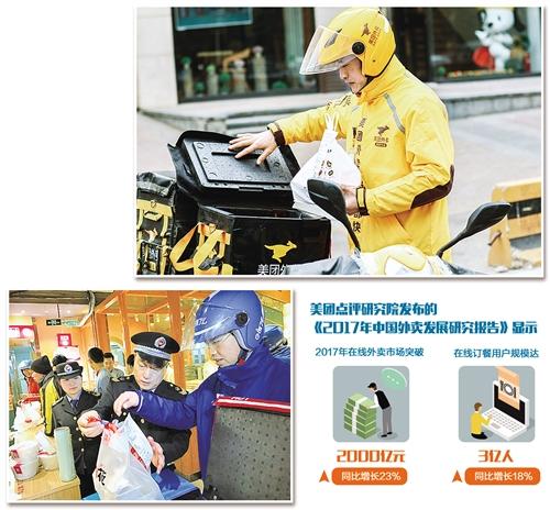 快節(jié)奏的都市生活、迅捷的網(wǎng)絡(luò)支付和日益發(fā)達(dá)的配送網(wǎng)絡(luò),催生了以“美團(tuán)外賣”“百度外賣”“餓了么”等為代表的網(wǎng)絡(luò)餐飲服務(wù)平臺(tái)。美團(tuán)點(diǎn)評(píng)研究院發(fā)布的《2017年中國外賣發(fā)展研究報(bào)告》顯示,2017年在線外賣市場(chǎng)突破2000億元,同比增長23%;在線訂餐用戶規(guī)模達(dá)3億人,同比增長18%。
