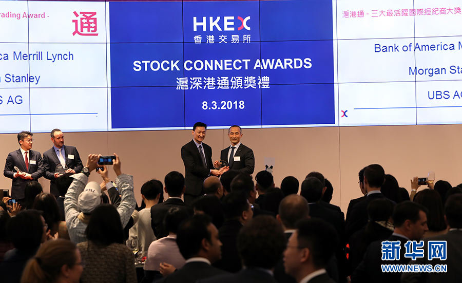 香港交易所舉辦2017年度“滬深港通”頒獎禮,表揚主要經(jīng)紀商于2017年參與“滬深港通”互聯(lián)互通股票交易機制所取得的成績(3月8日攝)。新華社記者 李鵬 攝
