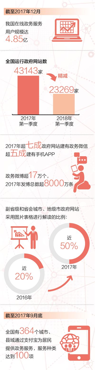 普查、抽查、整改、創(chuàng)新,這些年,全國政府網(wǎng)站“四不”問題基本解決,《政府網(wǎng)站發(fā)展指引》為網(wǎng)站怎么開辦提供高標(biāo)準(zhǔn)“施工圖”,網(wǎng)站管理水平和政務(wù)服務(wù)能力不斷提升。截至今年3月1日,全國運(yùn)行政府網(wǎng)站數(shù)達(dá)23269家。相比2017年第一季度的43143家,不到一年時間,體量“精減”一半。其中,縣級以下政府網(wǎng)站1645家,相比2017年一季度減少九成多。