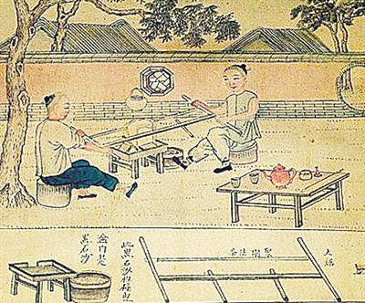 清代李澄淵在光緒十七年(1891年)應(yīng)英國醫(yī)士畢索普要求畫了一組《玉作圖》?!队褡鲌D》細致描繪了從搗沙研漿、開玉、解玉、粗磨、細磨、掏膛、磨琢紋飾等到最后拋光的各個制作環(huán)節(jié)的場景。