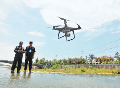 5月17日,浙江省杭州市臨安區(qū)天目山鎮(zhèn),河道管護(hù)隊(duì)員在操作無人機(jī)巡河。胡劍歡攝(人民視覺)