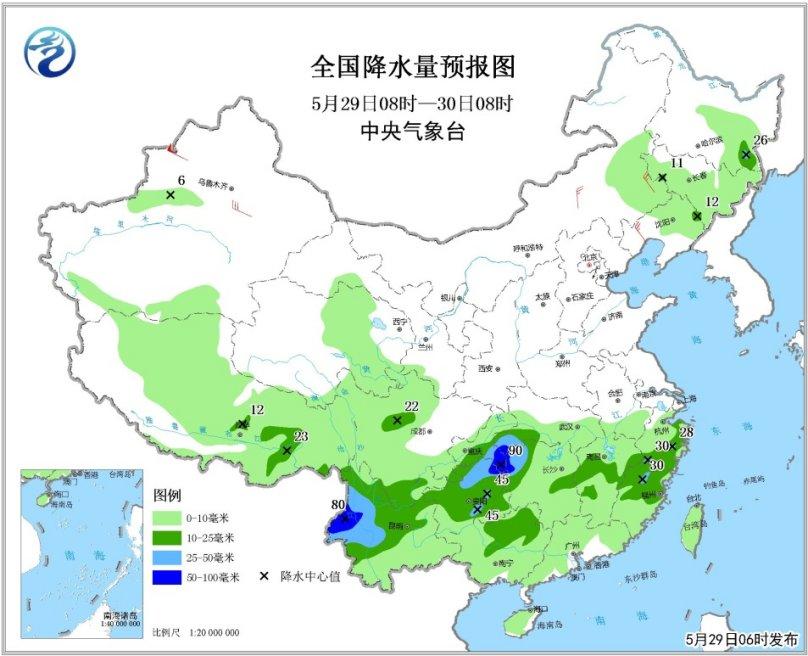 5月29日08時至30日08時,西藏、西南地區(qū)大部、江南、華南大部、黑龍江東部、吉林、遼寧中北部、內(nèi)蒙古東部等地有小到中雨,其中,云南西部、貴州中東部、重慶東南部、湖南西部等地的部分地區(qū)有大雨或暴雨(50~90毫米)。上述部分地區(qū)有短時強降水、雷暴大風等強對流天氣。新疆中北部、內(nèi)蒙古東部、東北地區(qū)西部等地的部分地區(qū)有4~6級風,北疆山口地區(qū)風力可達8~9級。黃海東北部海域、黃海西南部和東南部的部分海域?qū)⒂写箪F,能見度不足1公里。