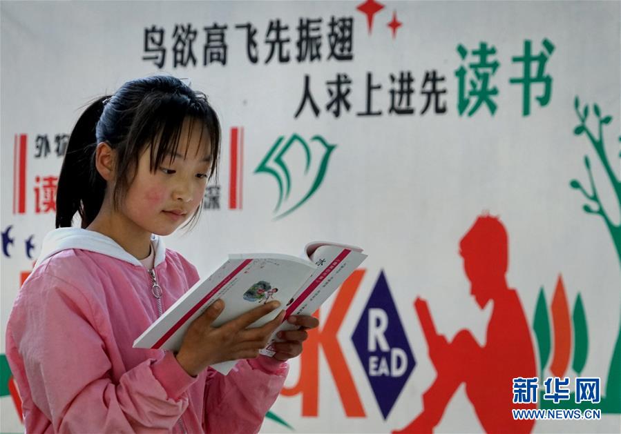 河南焦作市博愛縣寨豁鄉(xiāng)小學(xué)學(xué)生郭艷冰在校內(nèi)閱讀從“焦作市圖書館館外流通點(diǎn)”借閱的書籍(4月18日攝)。新華社記者 李安 攝