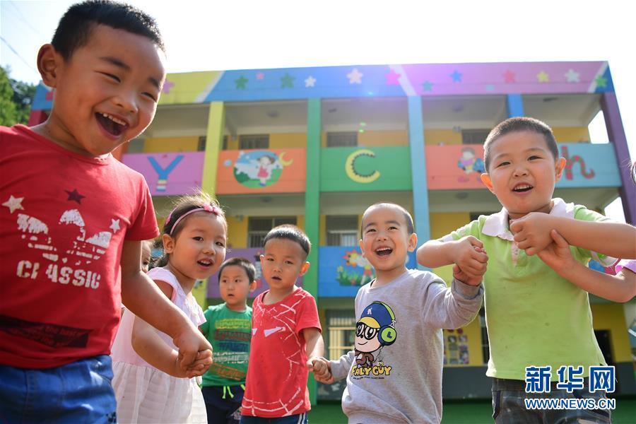 陜西省安康市漢濱區(qū)雙龍鎮(zhèn)杜壩村五四小學(xué)附設(shè)幼兒園小朋友們?cè)诓賵?chǎng)上做游戲(2017年6月16日攝)。這個(gè)幼兒園使用貸款資金翻修改造而成,有效解決了該村及周邊兒童學(xué)前教育缺失的問題。新華社記者 邵瑞 攝