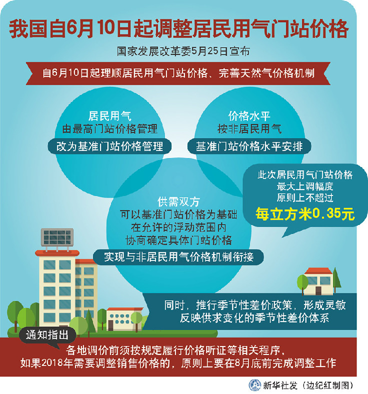 國(guó)家發(fā)展改革委5月25日宣布,自6月10日起理順居民用氣門(mén)站價(jià)格、完善價(jià)格機(jī)制。這是我國(guó)自2010年以來(lái)首次調(diào)整居民用氣門(mén)站價(jià)格,最大上調(diào)幅度原則上不超過(guò)每立方米0.35元。