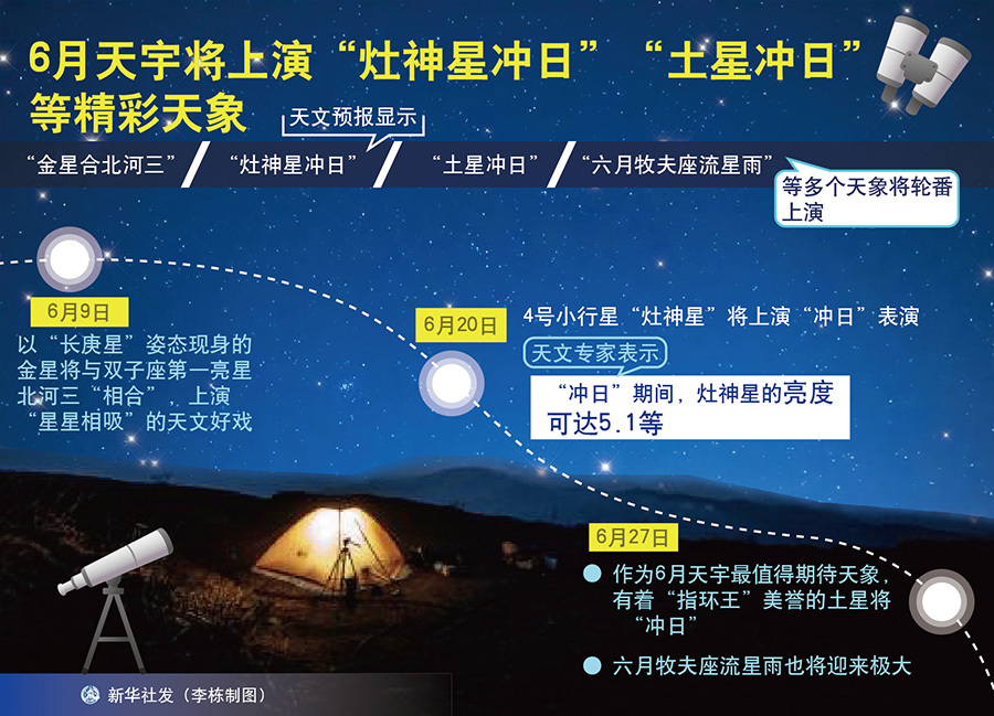 6月夜空,天象精彩。6月9日,以“長(zhǎng)庚星”姿態(tài)現(xiàn)身的金星將與雙子座第一亮星北河三“相合”,上演“星星相吸”的天文好戲。此外,4號(hào)小行星“灶神星”6月20日將上演“沖日”表演;有著“指環(huán)王”美譽(yù)的土星將于6月27日“沖日”;巧合的是,六月牧夫座流星雨也將于27日迎來(lái)極大。