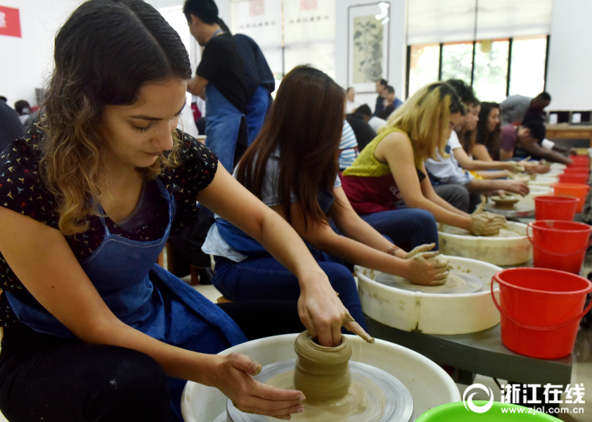 2018年6月3日,來自30多個國家的70多名留學(xué)生,在武義漢坊婺窯體驗館開心學(xué)習(xí)拉坯。