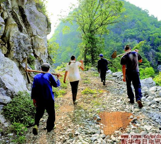 ▲西疇縣肖家塘村民小組4位修路人走在他們修通的路上。新華社資料片