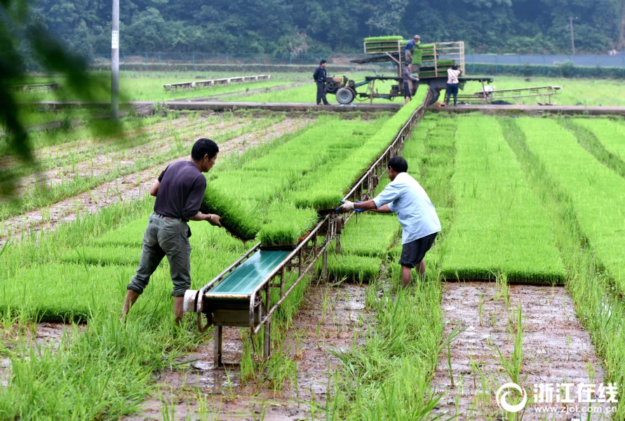 武義縣一育秧工廠員工忙著為訂單農戶起運單季稻秧苗。